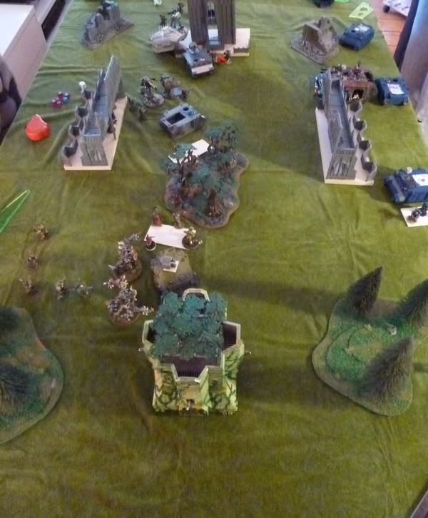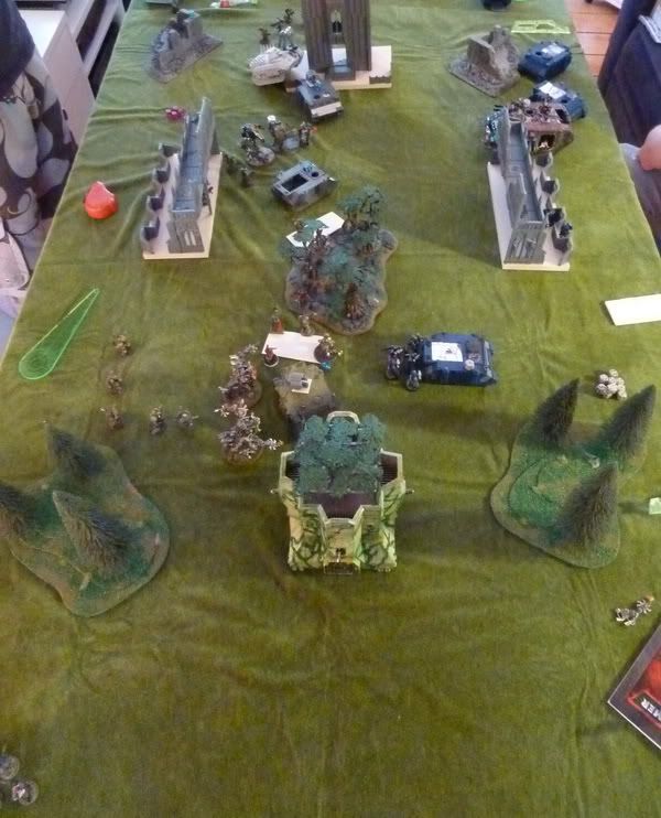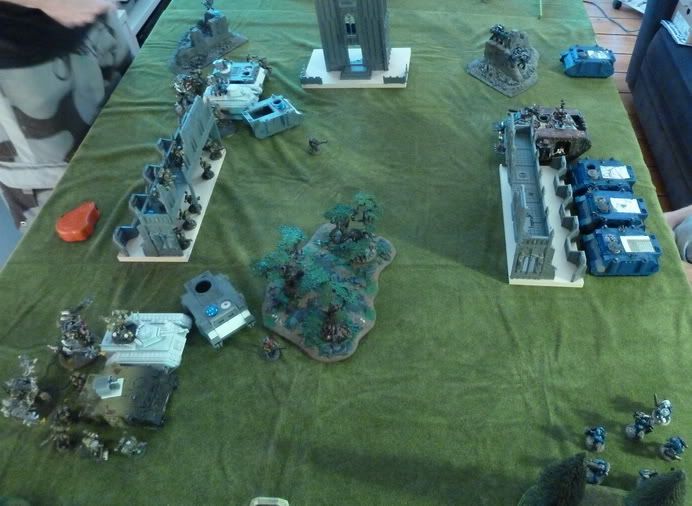 Landraider zentral an der 12" Linie, die Rbacks dahinter und hinter einer zentralen Ruine die LOS geblockt hat, die Long Fangs links und rechts etwa 12 Zoll vom LR entfernt in Ruine, und mehr oder weniger im freien. Scouts sind outflanken gegangen.