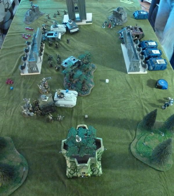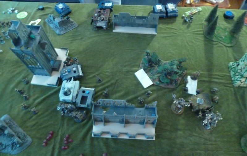 Kein Nachtkampf daher kann es losgehen. Alles rückt etwas vor, die Trupps aus der zentralen Ruine verlassen diese teilweise so das die Psycannons etwas treffen können. Der Trupp ganz links(der Land Raider Killer) läuft durch eine Ruine und nimmt die Long Fangs aufs Korn. Dieser Long Fang Trupp und sein Blutwolf Trupp mit UCM's verlieren einige Leute durch das Feuer der Linken Flanke. Rechts konzentriert sich das gesamte Feuer auf die Long Fangs mit Runenpriester.