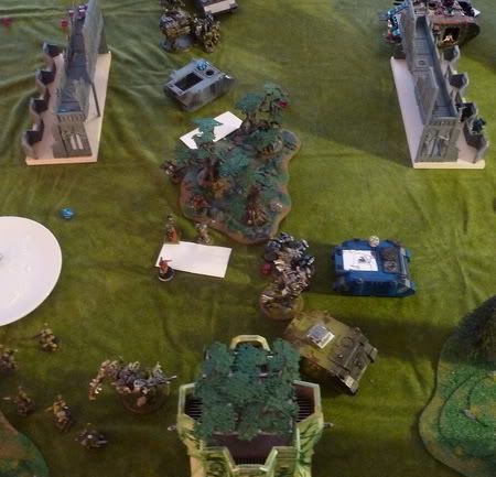 Rechts wird der Rest vom Long Fang Trupp zusammengeschossen. Der Inhalt des Affenmobils öffnet einen Rback, der andere wird geschüttelt daher keine Gefahr mehr auf dieser Seite.